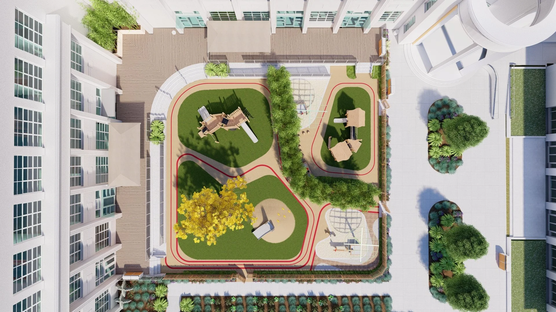 After: Once they saw our initial design, the client realized they wanted a play structure for the toddlers with a slide and other interactive elements. We researched play structure options and revised our design to accommodate the new feature.