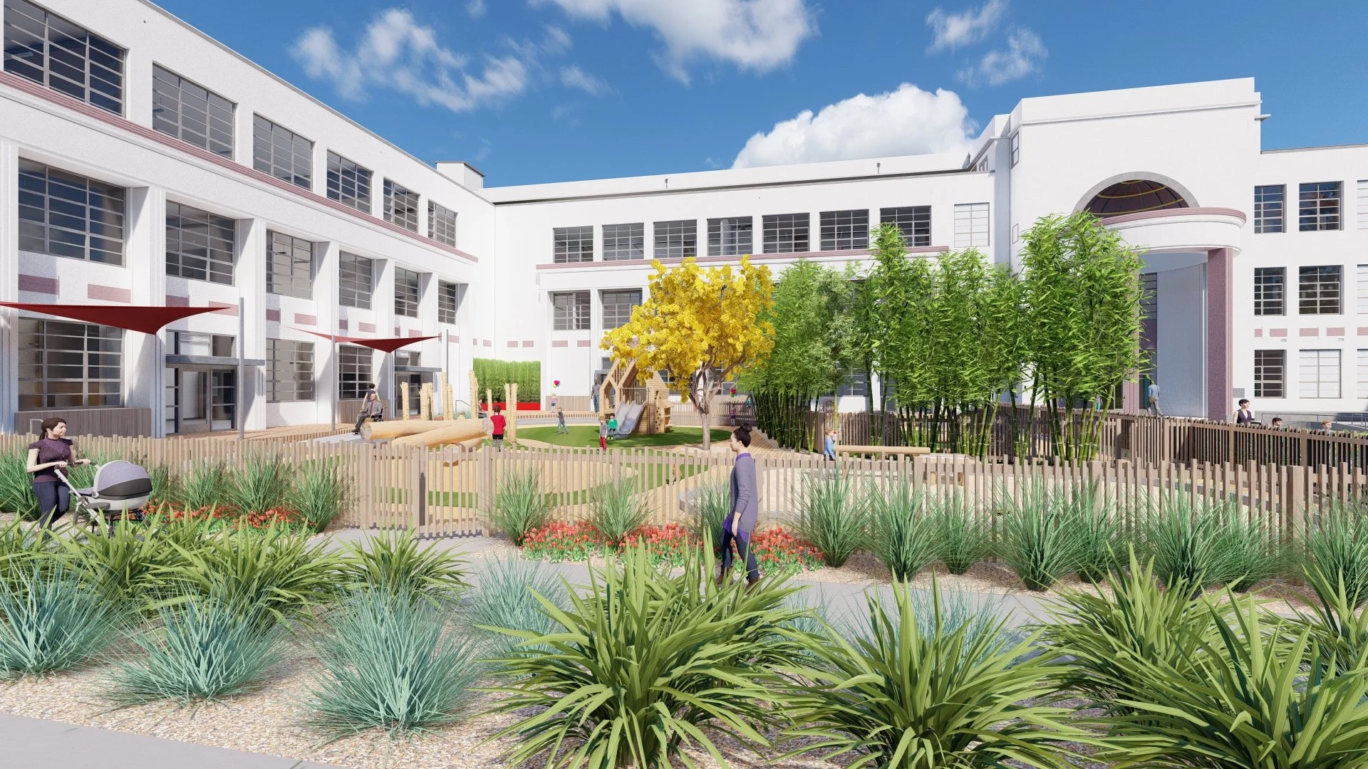 Create a cohesive campus landscape with dynamic play spaces for the early childhood (preschool-G1), lower school, and middle school students. Increase the campus accessibility, and update planting to improve sustainability.