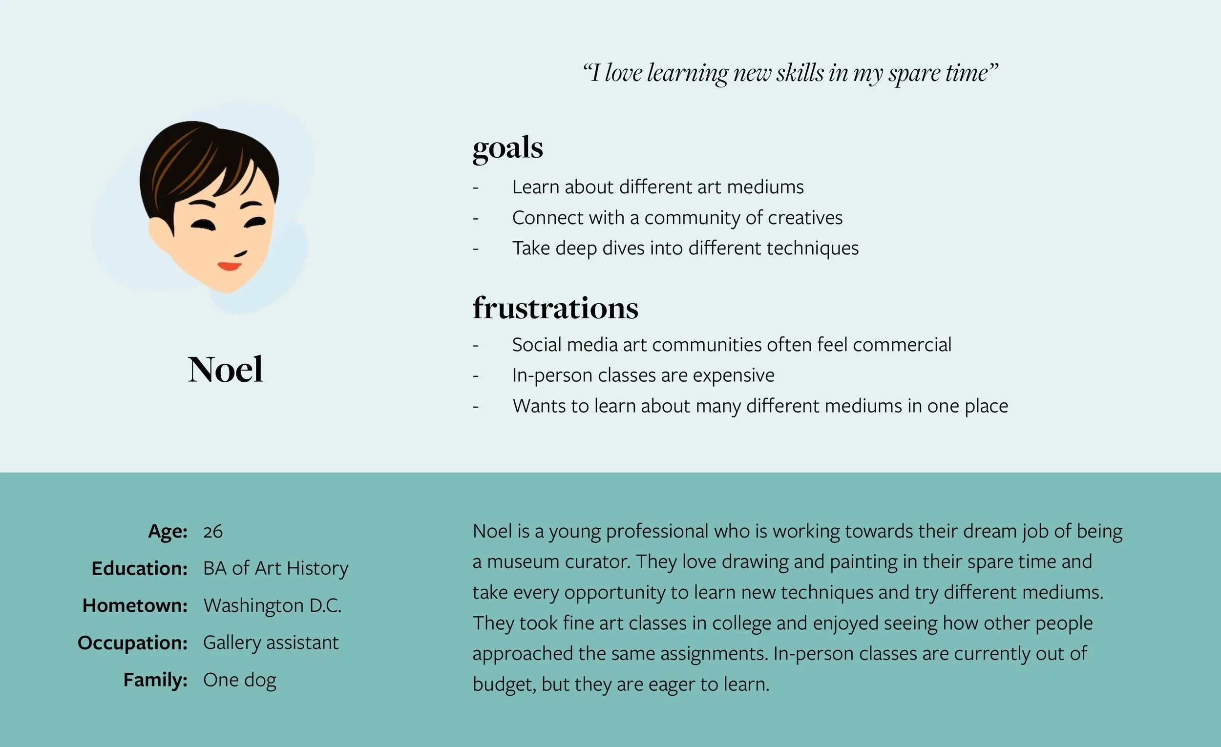 Noel is a young professional who needs a way to easily find affordable in-depth art tutorials so that they can fulfill their creative needs.